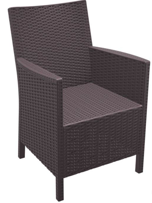 The California Tub Chair is an injection moulded resin chair, the non-metallic frame will never unravel rust or decay, with rattan look seat and back. Reinforced with glass fibre to strengthen the legs and boost the weight capacity. The California Tub Chair is designed for outdoor use. UV stable and weather proof it will not fade or go brittle in Australia’s harsh outdoor conditions. Strong yet lightweight this chair will add class to your venue. It’s sleek profile is pleasant to the eye so this chair is as charming as it is functional. Very easy to clean just hose it down.