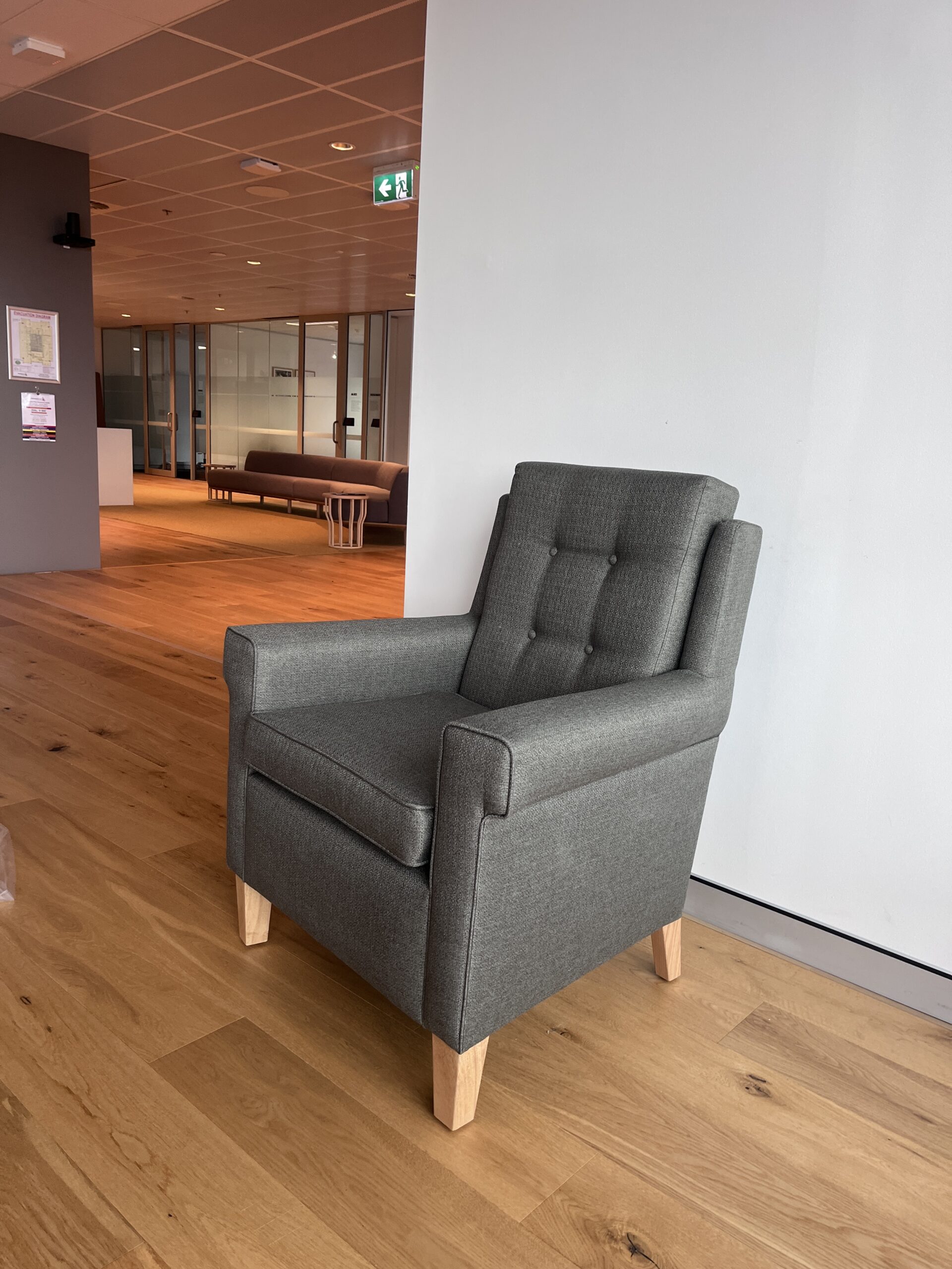 An elegant and modern arm chair, custom designed to suit a range of heights and sizes designed for comfort in a range of areas. Perfect for lounge rooms, bedrooms and libraries. 1020H x 600W (at back), 820W (at front). Seat Height: 490. Requires 5.5-6m fabric.