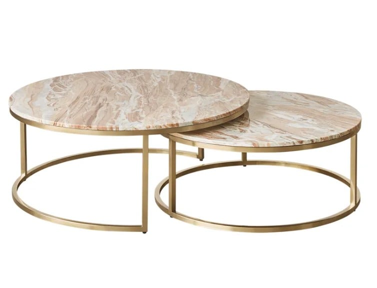 Make a refined statement in your living space with the Cleo Pink Marble Nesting Coffee Tables in Gold—where elegance meets everyday practicality. Each table features a soft matte pink marble top with subtle natural veining, beautifully complemented by a brushed gold stainless steel frame for a sophisticated, contemporary look.