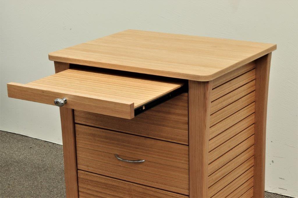 The Linear range combines the natural beauty of solid timber with hand-laid veneers, finished in a fresh, contemporary style. Available in multiple drawer configurations and stained finishes, these bedside tables feature a raised base for easy cleaning without the need to move the unit. This unit features 3 Drawers with a pull out breakfast tray,