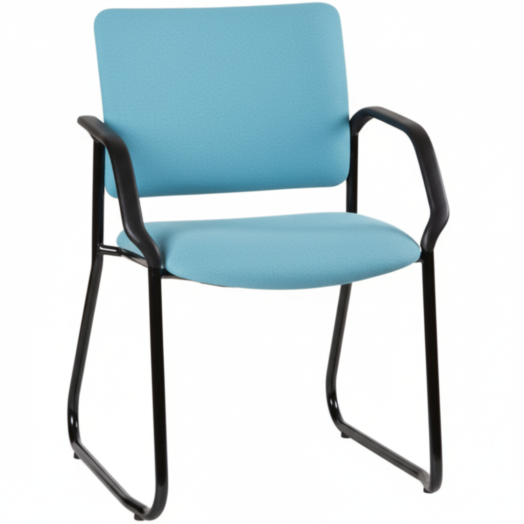 Australian Made Stackable Meteor Chair with square back, sled base and arms. 22mm tube frame, black powder coated legs and antimicrobial foam.