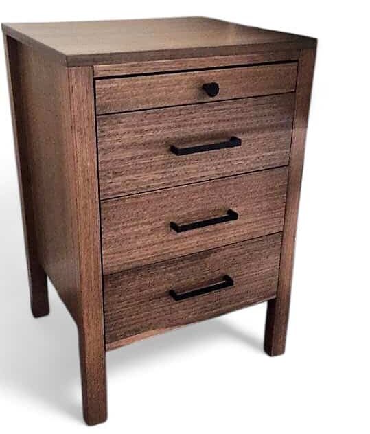 Contemporary and made locally, the Progressive bedside table features three drawers, and a pullout breakfast tray. Available in a range of stained finishes.