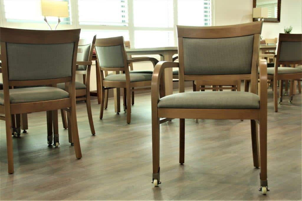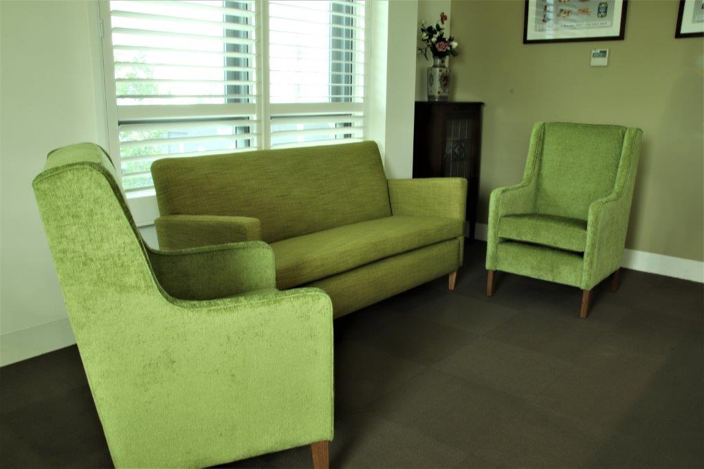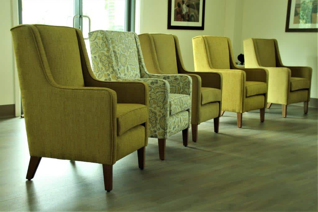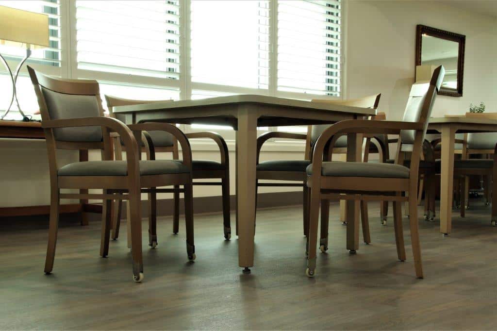 The client had a special request for dining chairs with castors on the front legs, which was not in our existing range. We engaged specialist Engineers to develop a new stainless steel chair leg plate, with double ball bearing castors to attach to the front legs. The chairs also featured easy-to-clean vinyl and bleach friendly Warwick Tritan fabrics. We also provided the Marlena armchairs and Bentley 3 seaters which were all upholstered in colour co-ordinated fabrics by wing and by room.