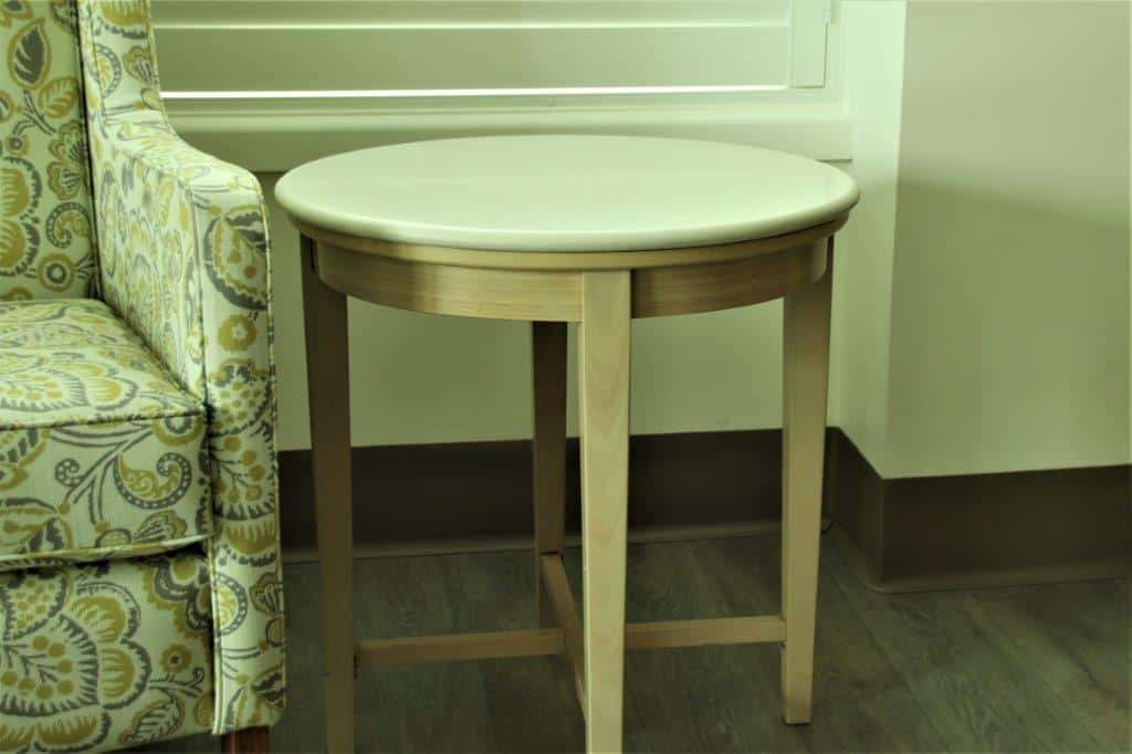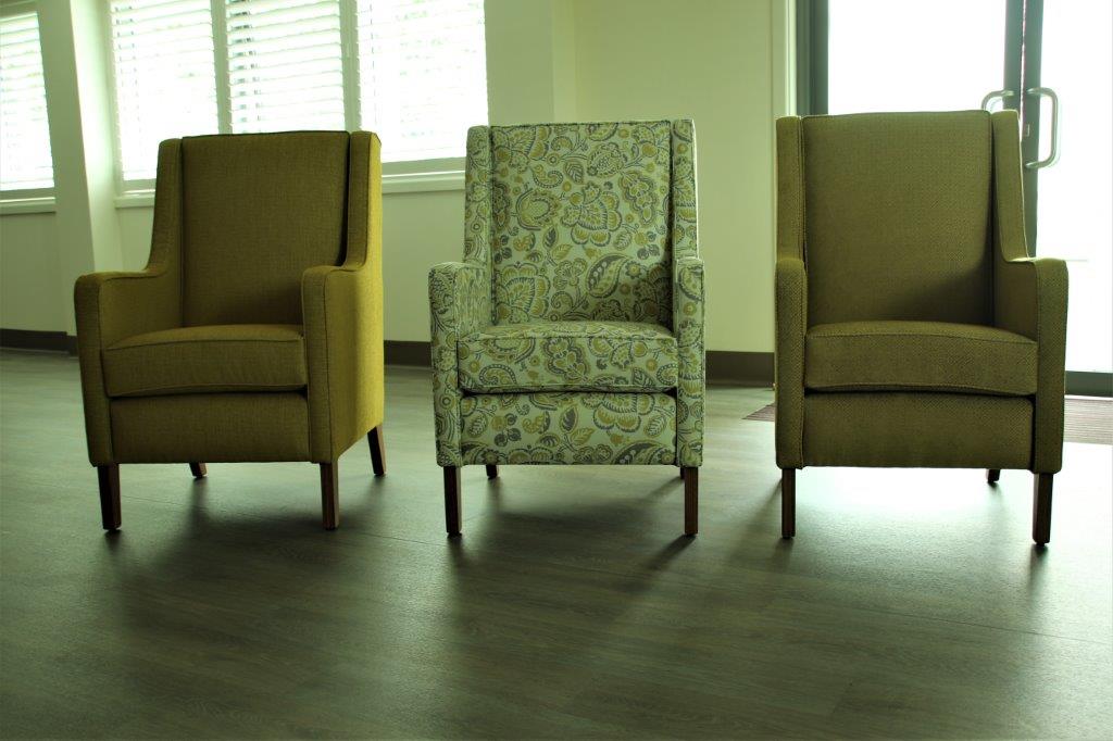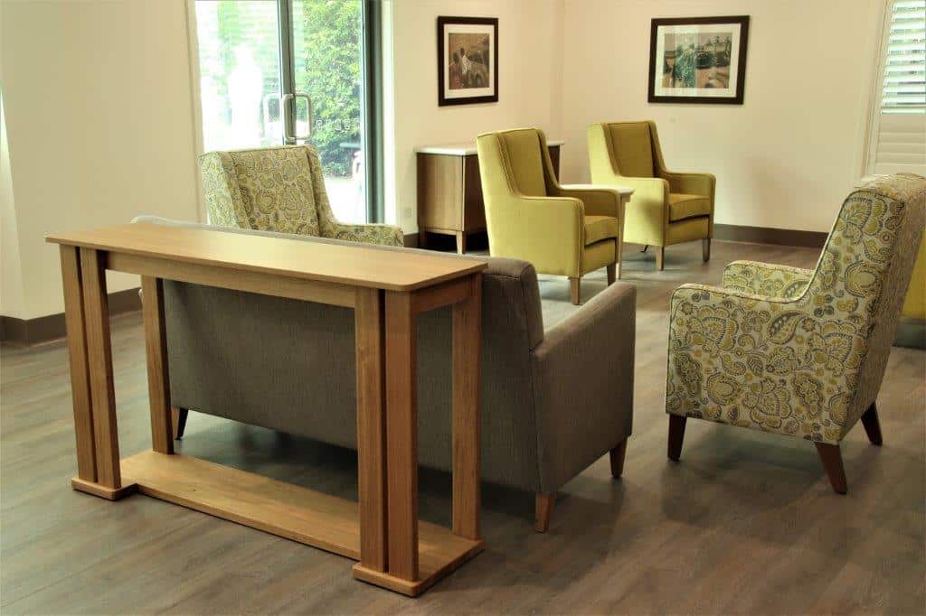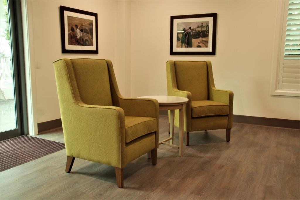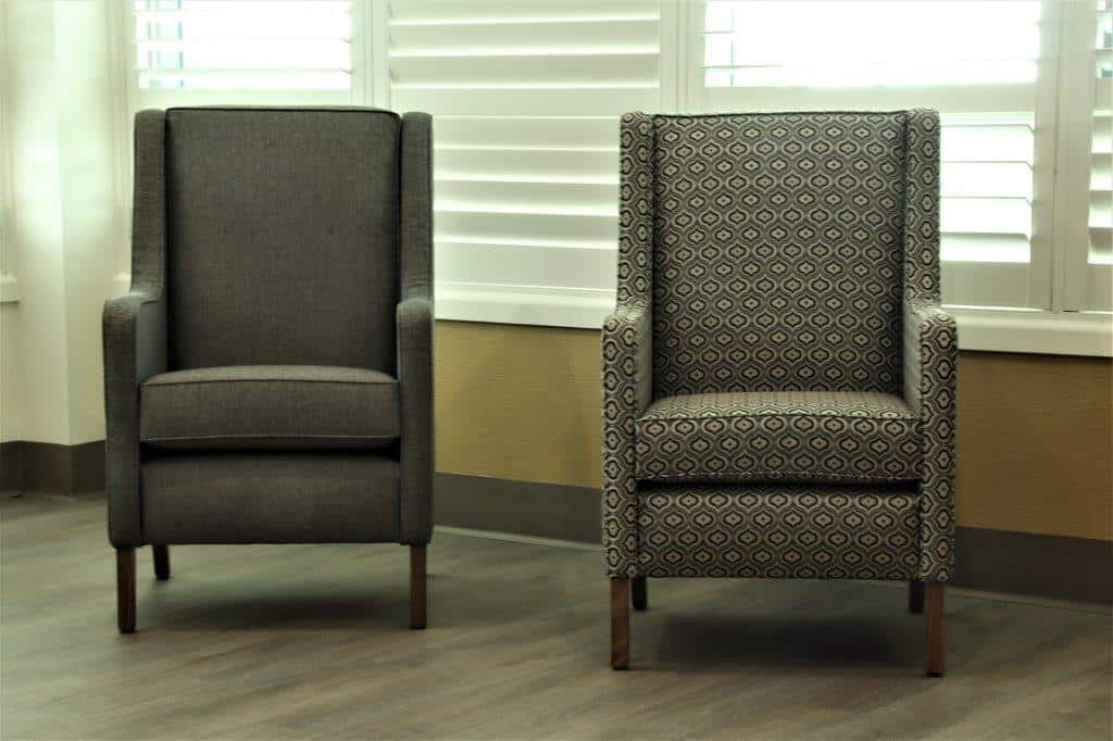 The client had a special request for dining chairs with castors on the front legs, which was not in our existing range. We engaged specialist Engineers to develop a new stainless steel chair leg plate, with double ball bearing castors to attach to the front legs. The chairs also featured easy-to-clean vinyl and bleach friendly Warwick Tritan fabrics. We also provided the Marlena armchairs and Bentley 3 seaters which were all upholstered in colour co-ordinated fabrics by wing and by room.